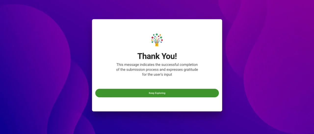 Thank You! This message indicates the successful completion of the submission process and expresses gratitude for the user’s input Keep Exploring