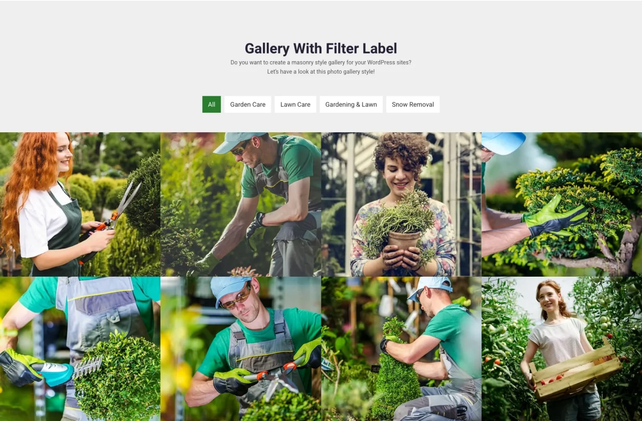 Gallery With Filter Label Do you want to create a masonry style gallery for your WordPress sites? Let’s have a look at this photo gallery style! All Garden Care Lawn Care Gardening & Lawn Snow Removal Garden Care Garden Care Lawn Care Lawn Care Gardening & Lawn Gardening & Lawn Snow Removal Snow Removal