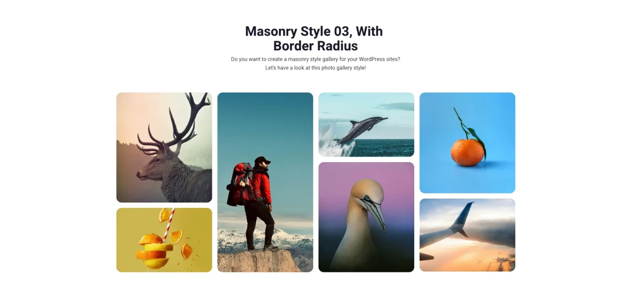 Masonry Style 03, With Border Radius Do you want to create a masonry style gallery for your WordPress sites? Let’s have a look at this photo gallery style!