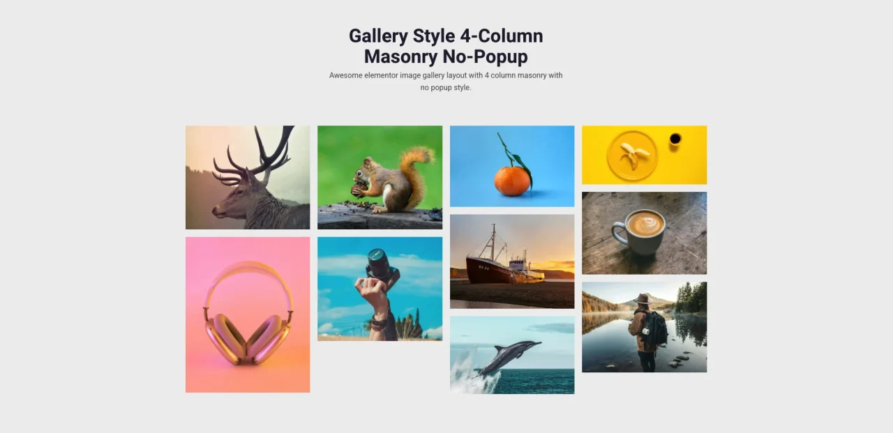 Gallery Style 4-Column Masonry No-Popup Awesome elementor image gallery layout with 4 column masonry with no popup style.