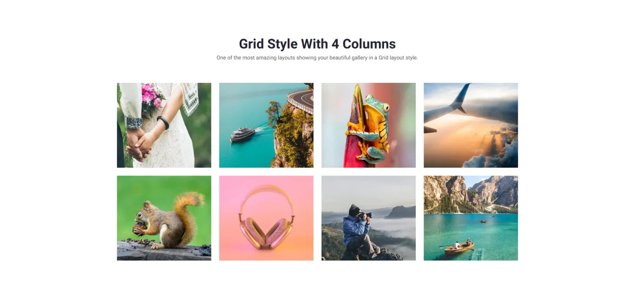Grid Style With 4 Columns One of the most amazing layouts showing your beautiful gallery in a Grid layout style.