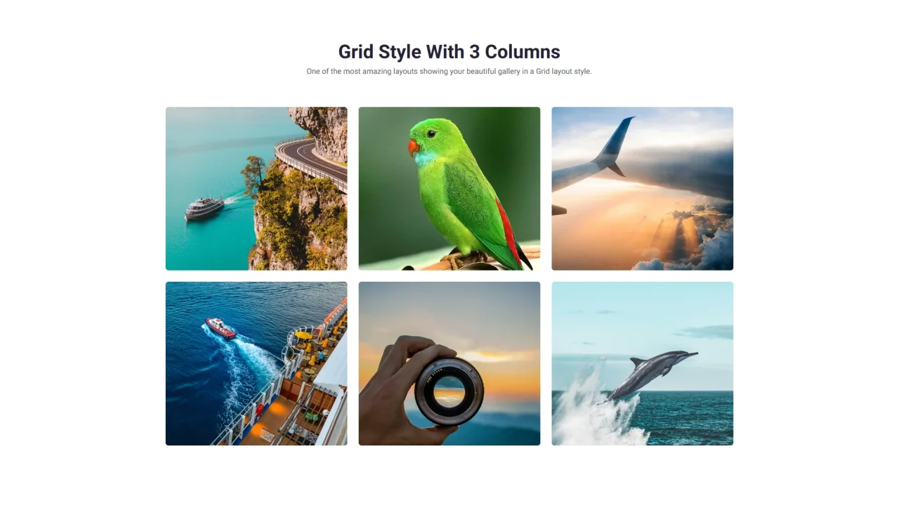 Grid Style With 3 Columns One of the most amazing layouts showing your beautiful gallery in a Grid layout style.