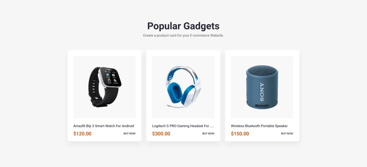 Popular Gadgets Create a product card for your E-commerce Website. Amazfit Bip 3 Smart Watch for Android $120.00 BUY NOW Logitech G PRO Gaming Headset for …. $300.00 BUY NOW Wireless Bluetooth Portable Speaker $150.00 BUY NOW