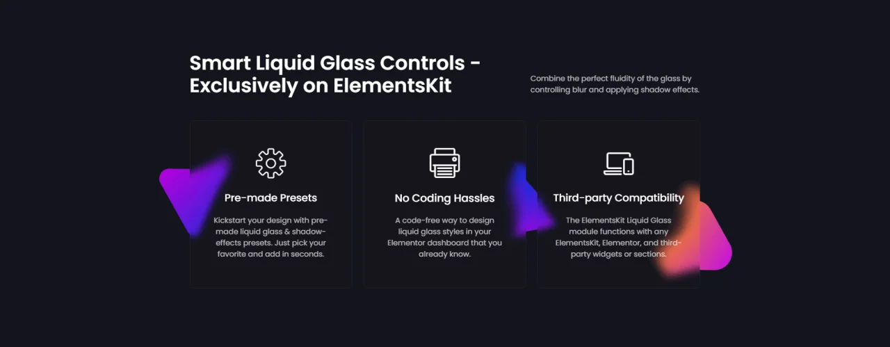 Smart Liquid Glass Controls – Exclusively on ElementsKit Combine the perfect fluidity of the glass by controlling blur and applying shadow effects. Pre-made Presets Kickstart your design with pre-made liquid glass & shadow-effects presets. Just pick your favorite and add in seconds. No Coding Hassles A code-free way to design liquid glass styles in your […]