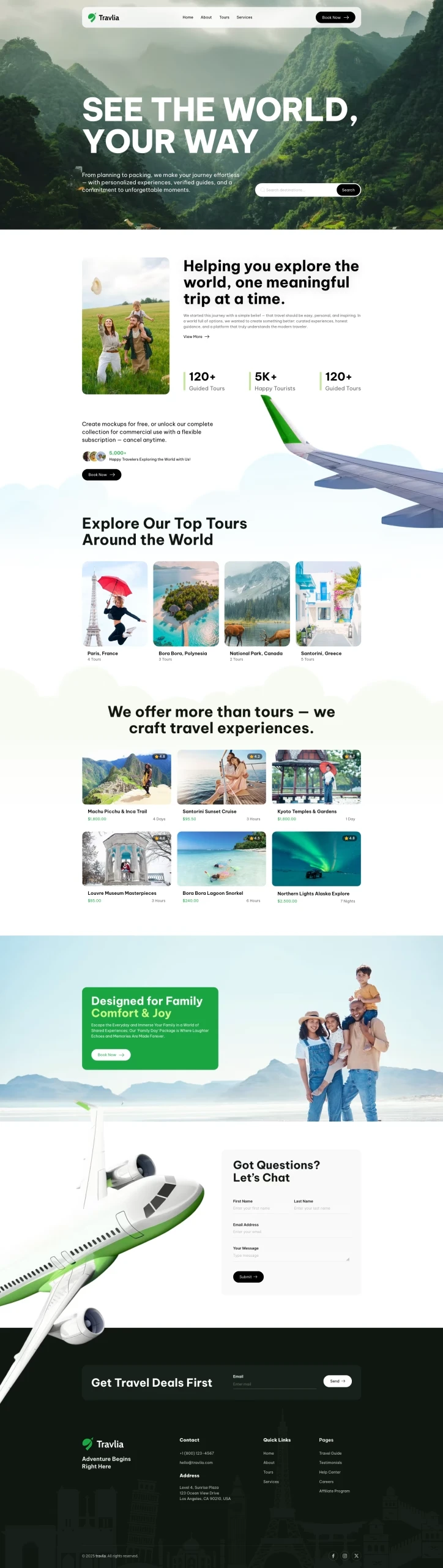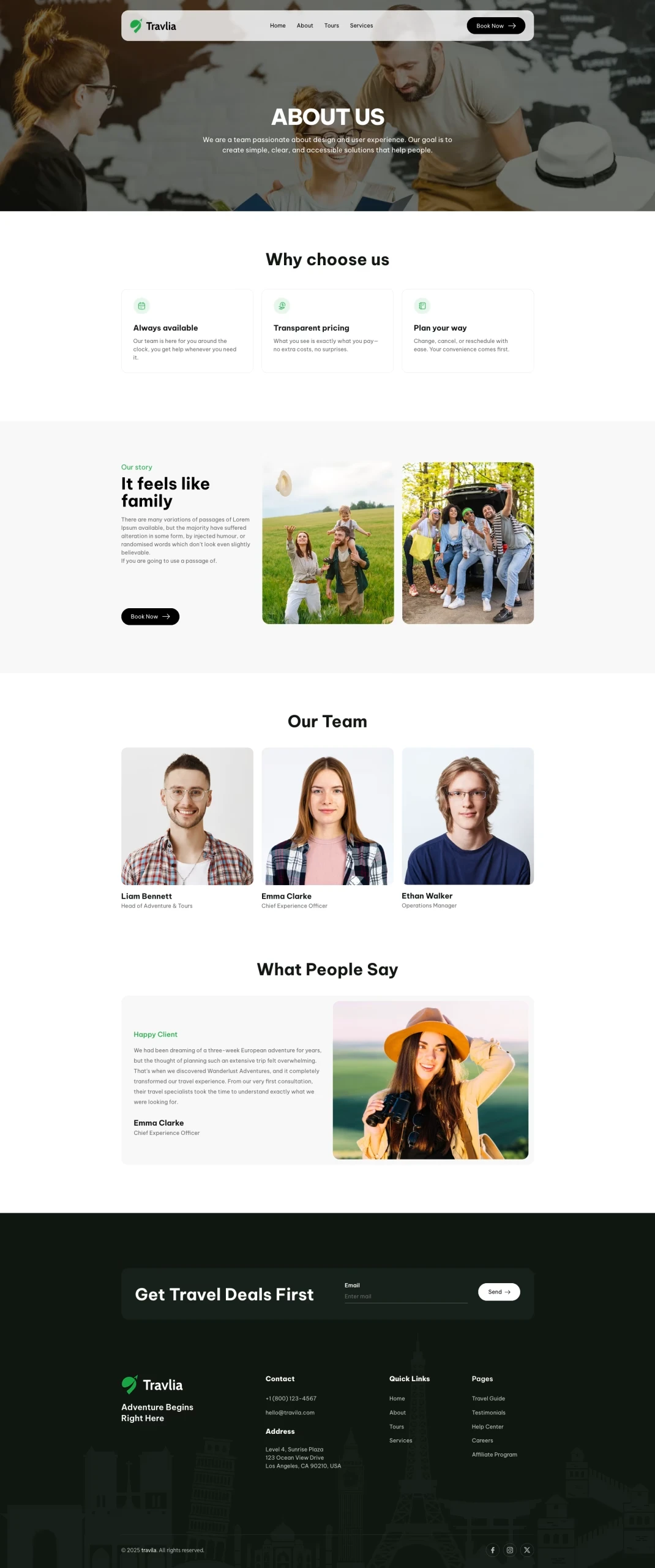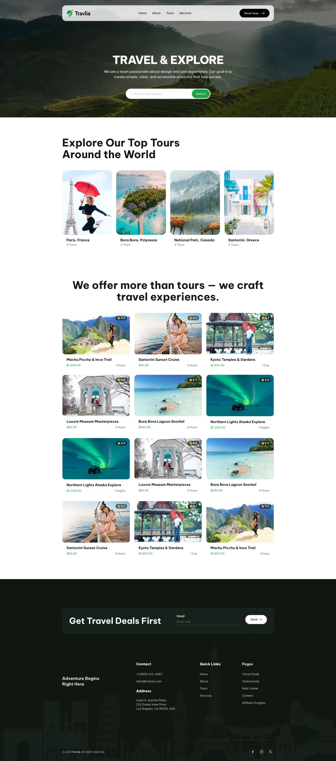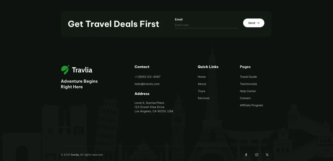 Get Travel Deals First Adventure Begins Right Here Quick Links +1 (800) 123-4567 [email protected] Quick Links Level 4, Sunrise Plaza 123 Ocean View Drive Los Angeles, CA 90210, USA Find Events Home About Tours Services Solutions Travel Guide Testimonials Help Center Careers Affiliate Program © 2025 travila. All rights reserved. Icon-facebook X-twitter Instagram