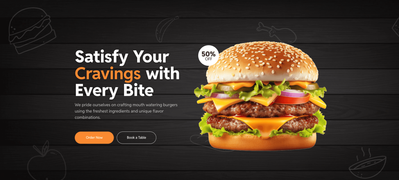 Satisfy Your Cravings with Every Bite We pride ourselves on crafting mouth watering burgers using the freshest ingredients and unique flavor combinations. Order Now Book a Table 50% OFF