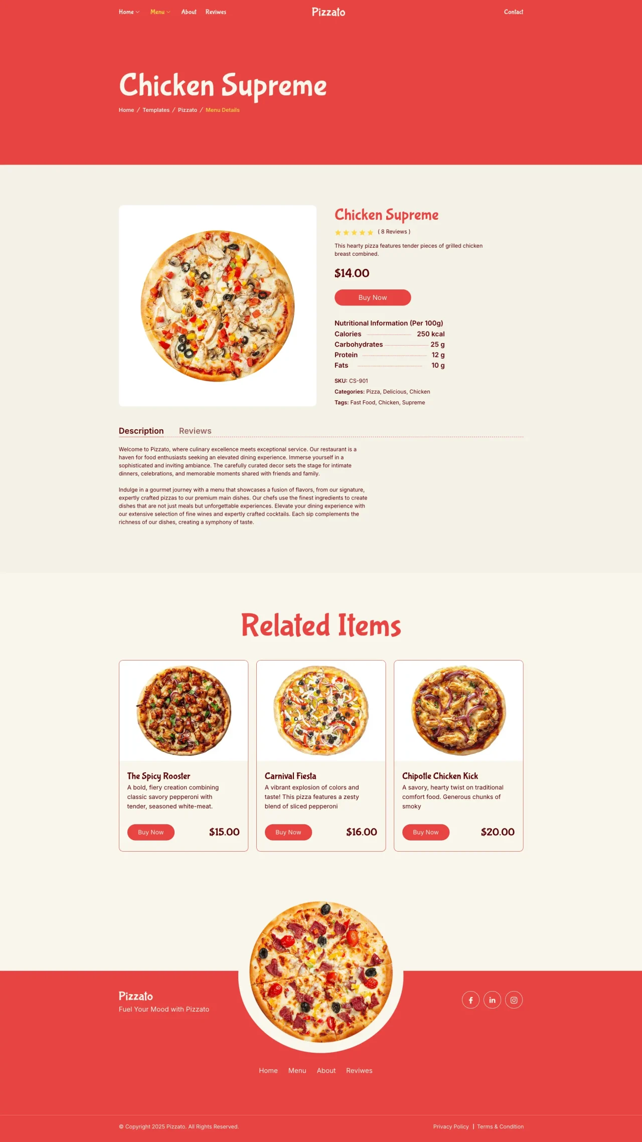 Chicken Supreme Home Chicken Supreme ( 8 Reviews ) This hearty pizza features tender pieces of grilled chicken breast combined. $14.00 Buy Now Nutritional Information (Per 100g) Calories 250 kcal Carbohydrates 25 g Protein 12 g Fats 10 g SKU: CS-901 Categories: Pizza, Delicious, Chicken Tags: Fast Food, Chicken, Supreme Description Reviews Edit Content Welcome […]