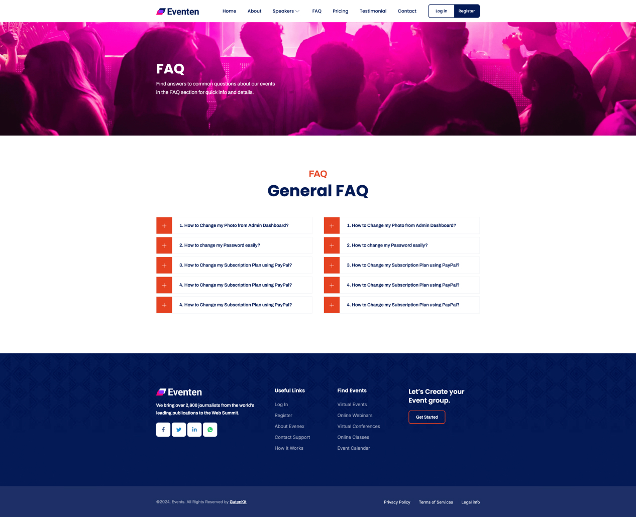 FAQ Find answers to common questions about our events in the FAQ section for quick info and details. Testimonial General FAQ 1. How to Change my Photo from Admin Dashboard? Edit Content Far far away, behind the word mountains, far from the countries Vokalia and Consonantia, there live the blind texts. Separated they live in […]