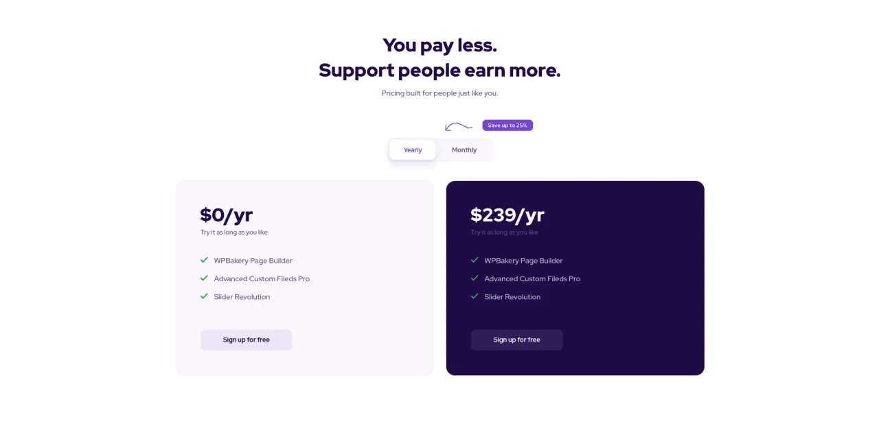 You pay less. Support people earn more. Pricing built for people just like you. Save up to 25% Yearly Monthly Edit Content $0/yr Try it as long as you like WPBakery Page Builder Advanced Custom Fileds Pro Slider Revolution Sign up for free $239/yr Try it as long as you like WPBakery Page Builder Advanced […]