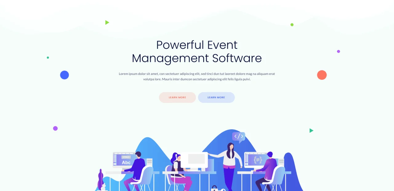 Powerful Event Management Software Lorem ipsum dolor sit amet, con sectetuer adipiscing elit, sed tinci dun tut laoreet dolore mag na aliquam erat volutpa lore. Mauris inter dumcon sectetuer adipiscing elit felis ligula pulvi. Learn more Learn more