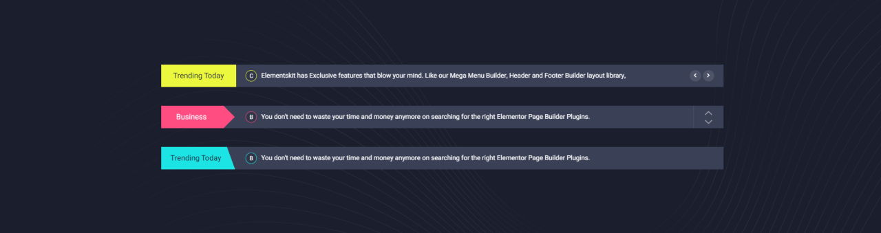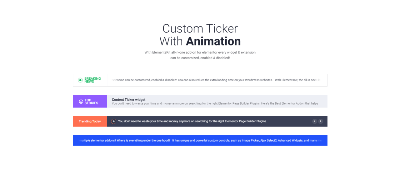 Custom Ticker With Animation With ElementsKit all-in-one add-on for elementor every widget & extension can be customized, enabled & disabled! Breaking News With ElementsKit, the all-in-one Elementor addon, every widget & extension can be customized, enabled & disabled! You can also reduce the extra loading time on your WordPress websites. With ElementsKit, the all-in-one Elementor […]