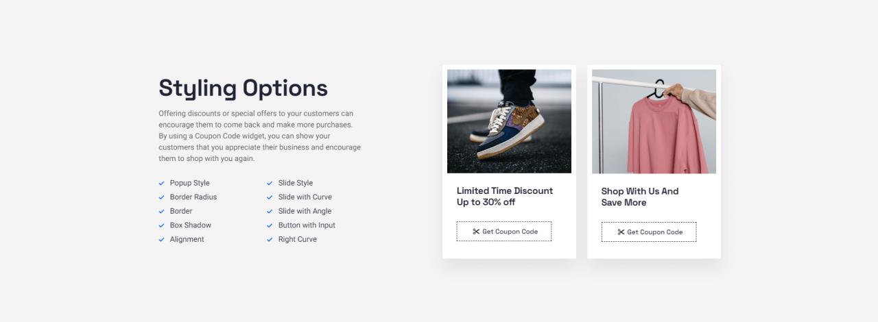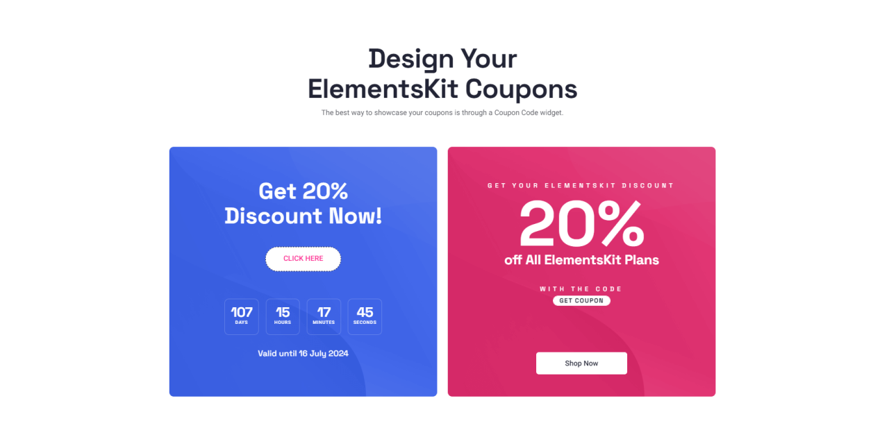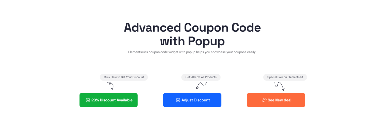 Advanced Coupon Codewith Popup ElementsKit’s coupon code widget with popup helps you showcase your coupons easily. Click Here to Get Your Discount 20% Discount Available COMMUNITY20 Special Offer 20% OFF WooCommerce, and BigCommerce offer built-in coupon functionality. Use Coupon Code Copied! Get 20% off All Products Adjust Discount COMMUNITY20 Mega Sale 75% OFF To get […]
