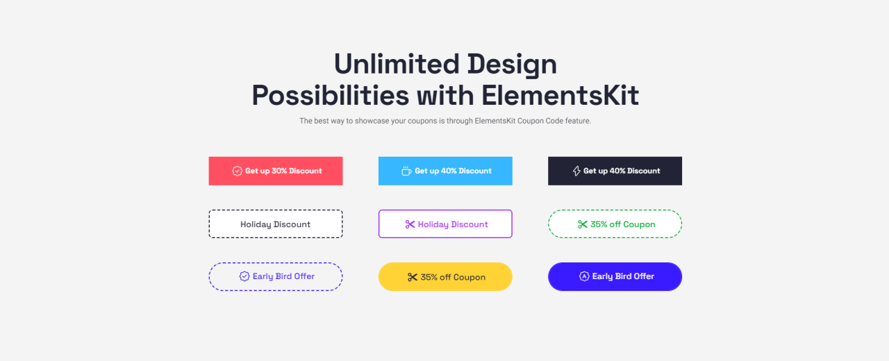 Unlimited DesignPossibilities with ElementsKit The best way to showcase your coupons is through ElementsKit Coupon Code feature. Get up 30% Discount XS46-58XS-XS25 Holiday Discount XS46-58XS-XS25 Early Bird Offer XS46-58XS-XS25 Get up 40% Discount XS46-58XS-XS25 Holiday Discount XS46-58XS-XS25 35% off Coupon XS46-58XS-XS25 Get up 40% Discount XS46-58XS-XS25 35% off Coupon XS46-58XS-XS25 Early Bird Offer XS46-58XS-XS25