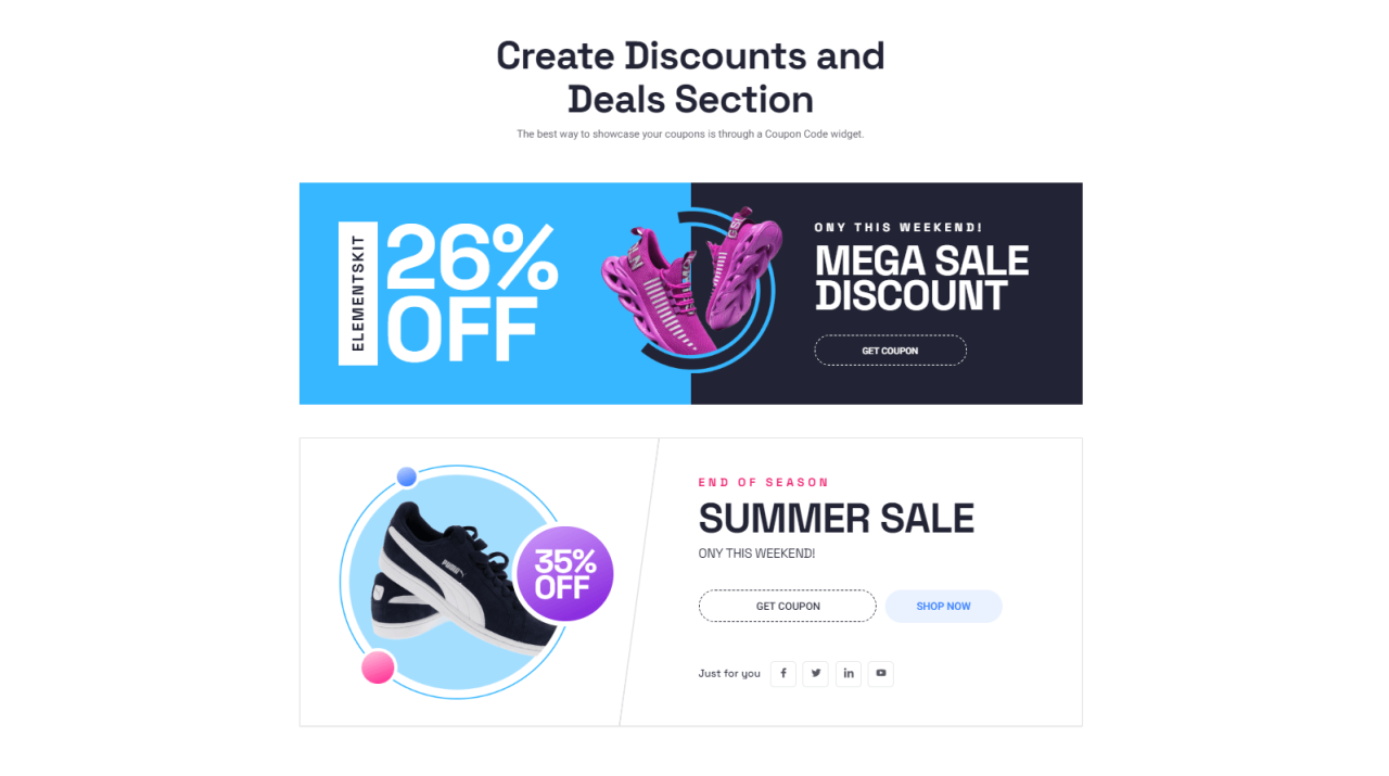 Create Discounts and Deals Section The best way to showcase your coupons is through a Coupon Code widget. 26% Off Ony this weekend! Mega SaleDiscount Get Coupon XS46-58XS-XS25 35%OFF End of Season Summer Sale Ony this weekend! Get Coupon wp06-58wp-wp25 Elementskit Addon for Elementor Coupon Code Widget To get started with a Coupon Code o […]