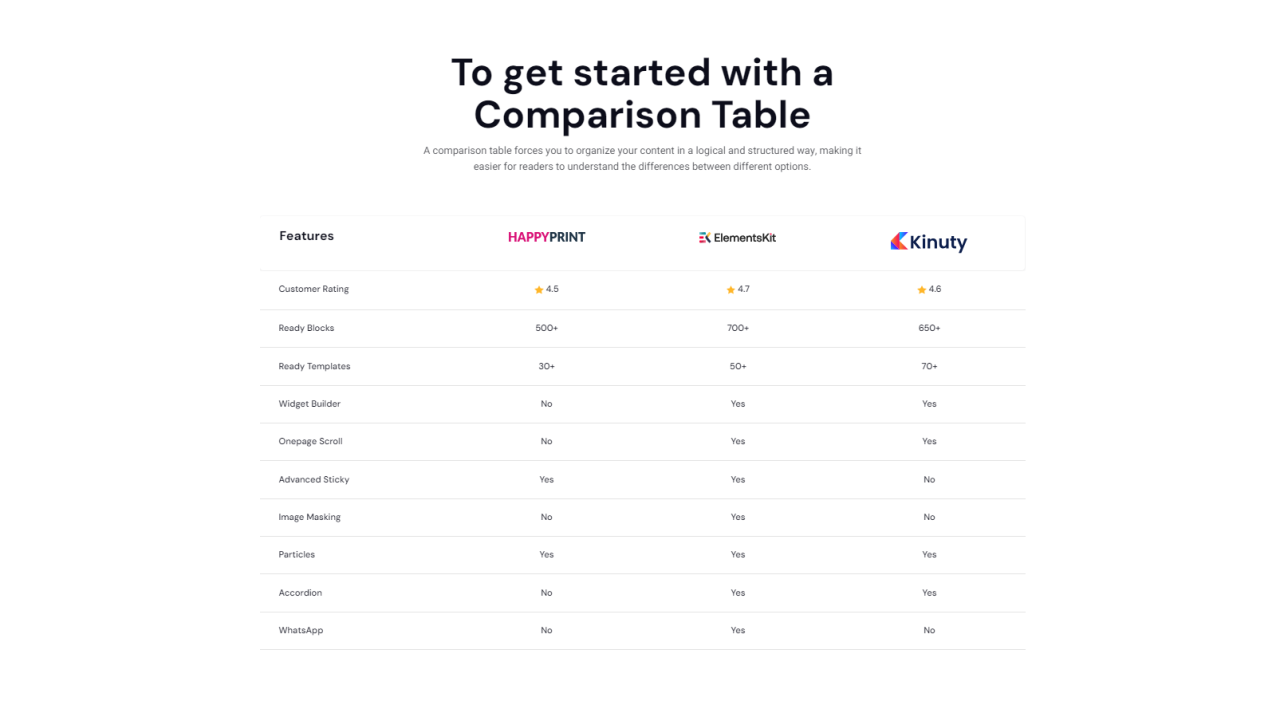 To get started with a Comparison Table A comparison table forces you to organize your content in a logical and structured way, making it easier for readers to understand the differences between different options. Features Customer Rating 4.5 4.7 4.6 Ready Blocks 500+ 700+ 650+ Ready Templates 30+ 50+ 70+ Widget Builder No Yes Yes […]