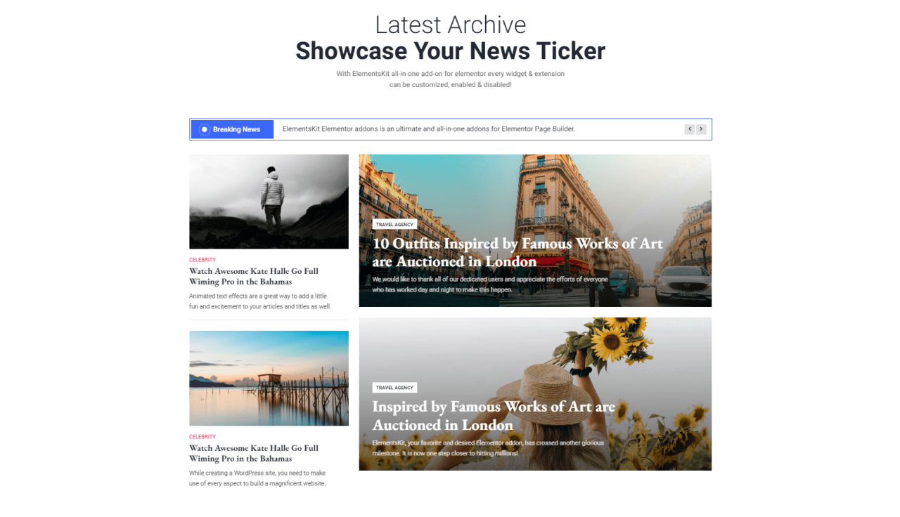 Latest ArchiveShowcase Your News Ticker With ElementsKit all-in-one add-on for elementor every widget & extension can be customized, enabled & disabled! Breaking News ElementsKit Elementor addons is an ultimate and all-in-one addons for Elementor Page Builder. It includes the most comprehensive modules, such as Header Footer Builder, Mega Menu Builder, Layout template Library It has […]