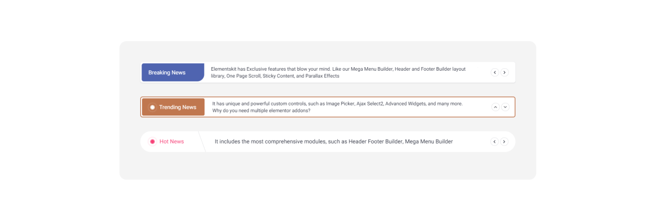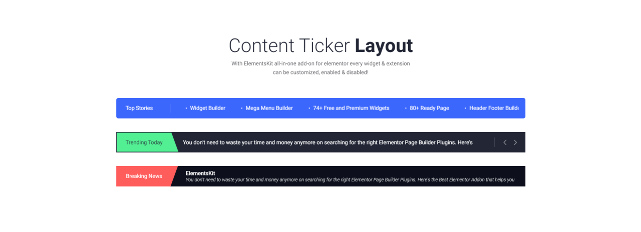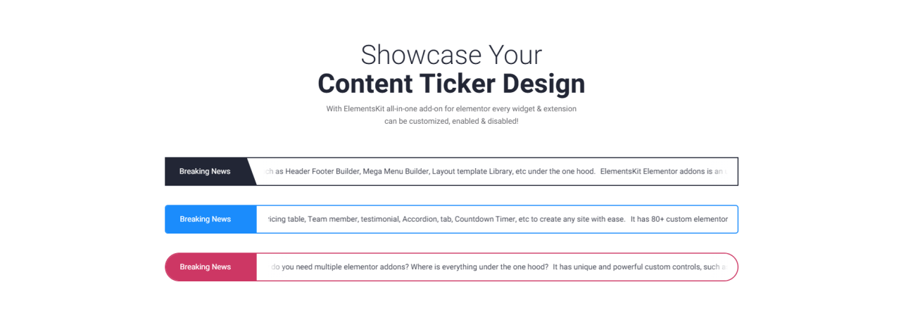 Showcase Your Content Ticker Design With ElementsKit all-in-one add-on for elementor every widget & extension can be customized, enabled & disabled! Breaking News ElementsKit Elementor addons is an ultimate and all-in-one addons for Elementor Page Builder. It includes the most comprehensive modules, such as Header Footer Builder, Mega Menu Builder, Layout template Library, etc under […]