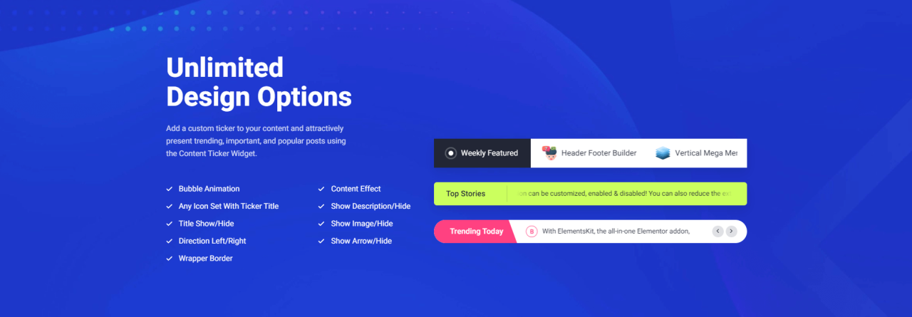 Content Ticker Layout With ElementsKit all-in-one add-on for elementor every widget & extension can be customized, enabled & disabled! Top Stories Header Footer Builder Widget Builder Mega Menu Builder 74+ Free and Premium Widgets 80+ Ready Page Trending Today You don't need to waste your time and money anymore on searching for the right Elementor […]
