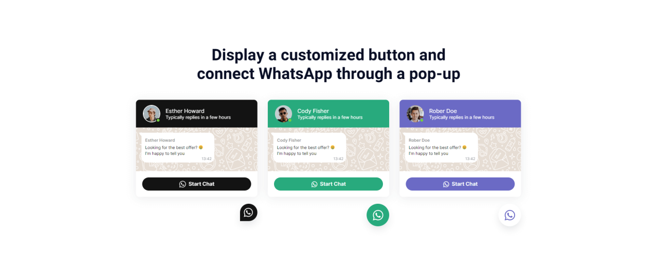 Display a customized button and connect WhatsApp through a pop-up Esther Howard Typically replies in a few hours Esther Howard Looking for the best offer? π€ I’m happy to tell you Start Chat Cody Fisher Typically replies in a few hours Cody Fisher Looking for the best offer? π€ I’m happy to tell you Start […]