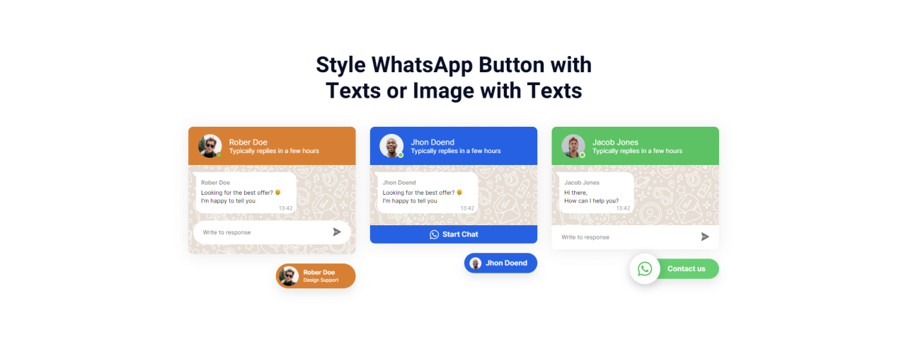 Style WhatsApp Button with Texts or Image with Texts Rober Doe Typically replies in a few hours Rober Doe Looking for the best offer? π€ I’m happy to tell you Rober Doe Design Support Jhon Doend Typically replies in a few hours Jhon Doend Looking for the best offer? π€ I’m happy to tell you […]