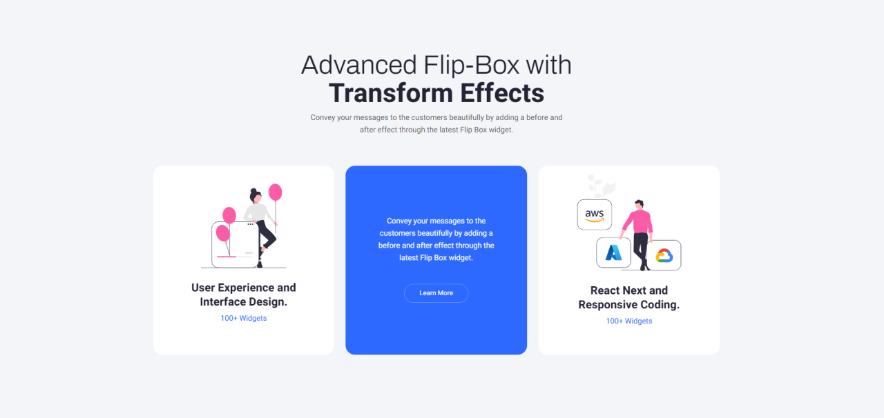 Advanced Flip-Box with Transform Effects Convey your messages to the customers beautifully by adding a before and after effect through the latest Flip Box widget. User Experience and Interface Design. 100+ Widgets Convey your messages to the customers beautifully by adding a before and after effect through the latest Flip Box widget. Learn More Mobile […]