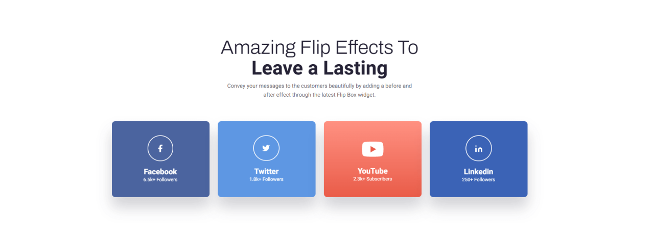 Amazing Flip Effects To Leave a Lasting Convey your messages to the customers beautifully by adding a before and after effect through the latest Flip Box widget. Facebook 6.5k+ Followers Facebook 6.5k+ Followers Twitter 1.8k+ Followers Twitter 1.8k+ Followers YouTube 2.3k+ Subscribers YouTube 2.3k+ Subscribers Linkedin 250+ Followers Linkedin 250+ Followers