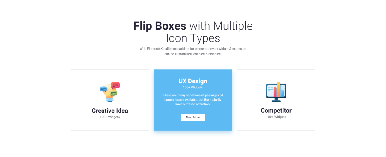 Flip Boxes with MultipleIcon Types With ElementsKit all-in-one add-on for elementor every widget & extension can be customized, enabled & disabled! Creative Idea 100+ Widgets Creative Idea 100+ Widgets There are many variations of passages of Lorem Ipsum available, but the majority have suffered alteration. Read More UX Design 100+ Widgets UX Design 100+ Widgets […]