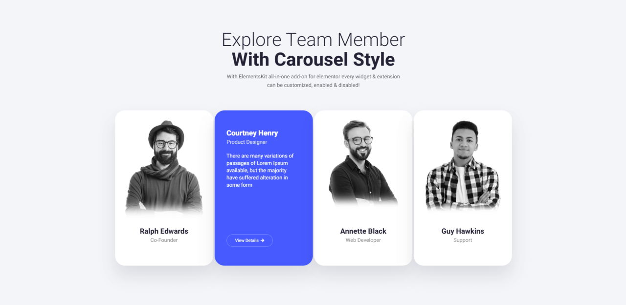 Explore Team MemberWith Carousel Style With ElementsKit all-in-one add-on for elementor every widget & extension can be customized, enabled & disabled! Ralph Edwards Co-Founder Ralph Edwards Co-Founder There are many variations of passages of Lorem Ipsum available, but the majority have suffered alteration in some form View Details Courtney Henry Product Designer Courtney Henry Product […]