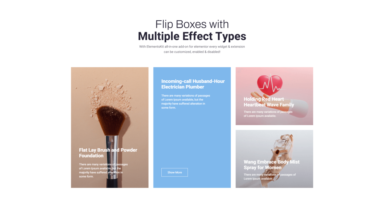 Flip Boxes with Multiple Effect Types With ElementsKit all-in-one add-on for elementor every widget & extension can be customized, enabled & disabled! Flat Lay Brush and Powder Foundation There are many variations of passages of Lorem Ipsum available, but the majority have suffered alteration in some form. Flat Lay Brush and Powder Foundation There are […]