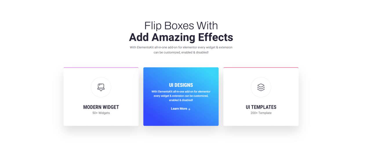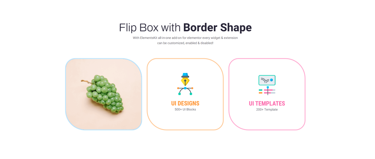 Flip Box with Border Shape With ElementsKit all-in-one add-on for elementor every widget & extension can be customized, enabled & disabled! Modern Widget 100+ Widgets UI Designs 500+ UI Blocks UI Templates 200+ Template