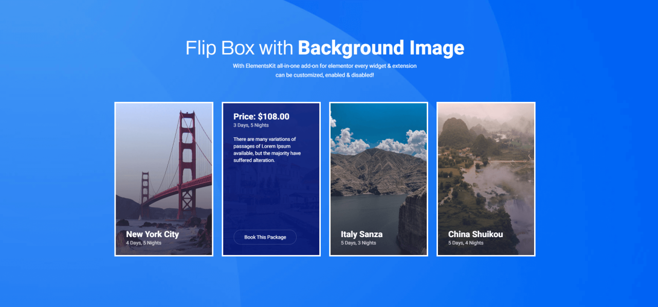 Flip Box with Background Image With ElementsKit all-in-one add-on for elementor every widget & extension can be customized, enabled & disabled! New York City 4 Days, 5 Nights Price: $120.00 4 Days, 5 Nights There are many variations of passages of Lorem Ipsum available, but the majority have suffered alteration. Book This Package New France […]