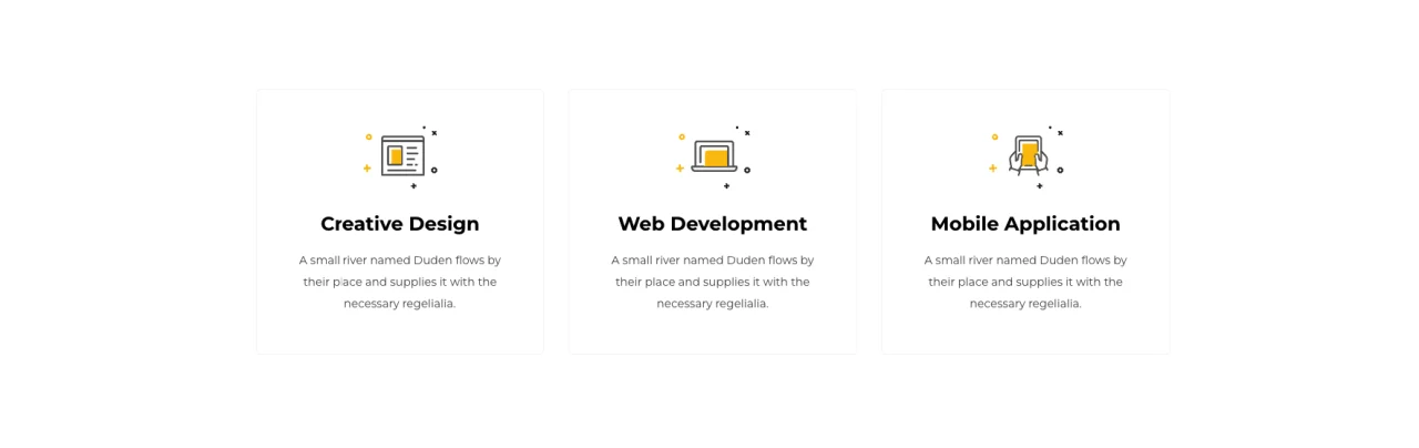 Creative Design A small river named Duden flows by their place and supplies it with the necessary regelialia. Web Development A small river named Duden flows by their place and supplies it with the necessary regelialia. Mobile Application A small river named Duden flows by their place and supplies it with the necessary regelialia.