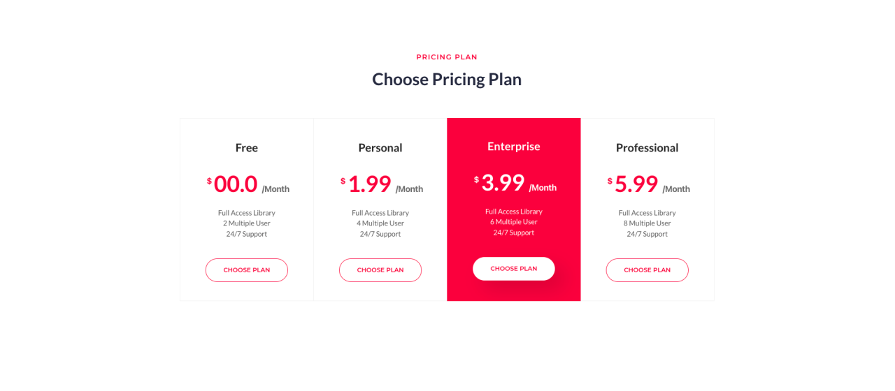 Pricing Plan Choose Pricing Plan Free $ 00.0 /Month Full Access Library 2 Multiple User 24/7 Support Choose Plan Personal $ 1.99 /Month Full Access Library 4 Multiple User 24/7 Support Choose Plan Enterprise $ 3.99 /Month Full Access Library 6 Multiple User 24/7 Support Choose Plan Professional $ 5.99 /Month Full Access Library 8 […]