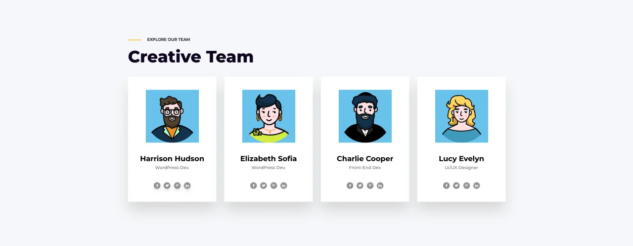 Explore our team Creative Team Harrison Hudson WordPress Dev. Elizabeth Sofia WordPress Dev. Charlie Cooper Front-End Dev Lucy Evelyn Ui/UX Designer