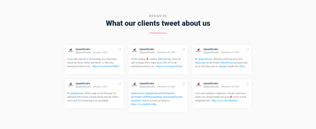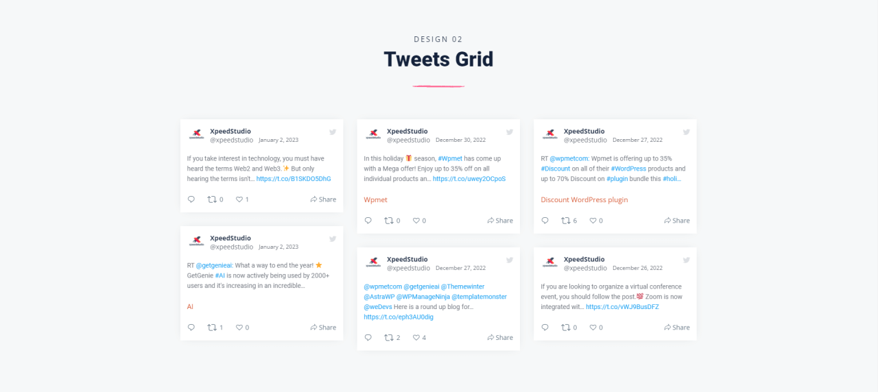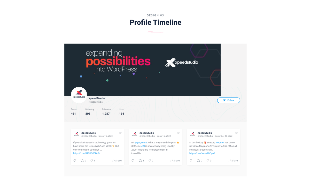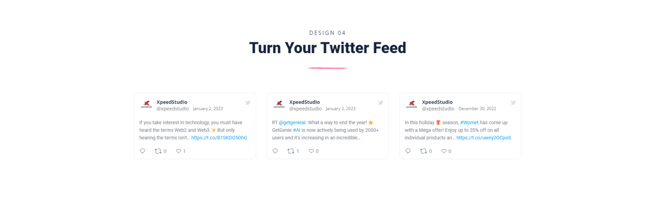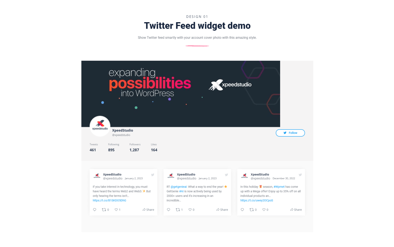 Design 01 Twitter Feed widget demo Show Twitter feed smartly with your account cover photo with this amazing style. You currently have access to a subset of X API V2 endpoints and limited v1.1 endpoints (e.g. media post, oauth) only. If you need access to this endpoint, you may need a different access level. You […]