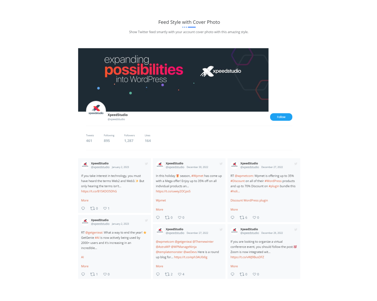 Feed Style with Cover Photo Show Twitter feed smartly with your account cover photo with this amazing style. You currently have access to a subset of X API V2 endpoints and limited v1.1 endpoints (e.g. media post, oauth) only. If you need access to this endpoint, you may need a different access level. You can […]