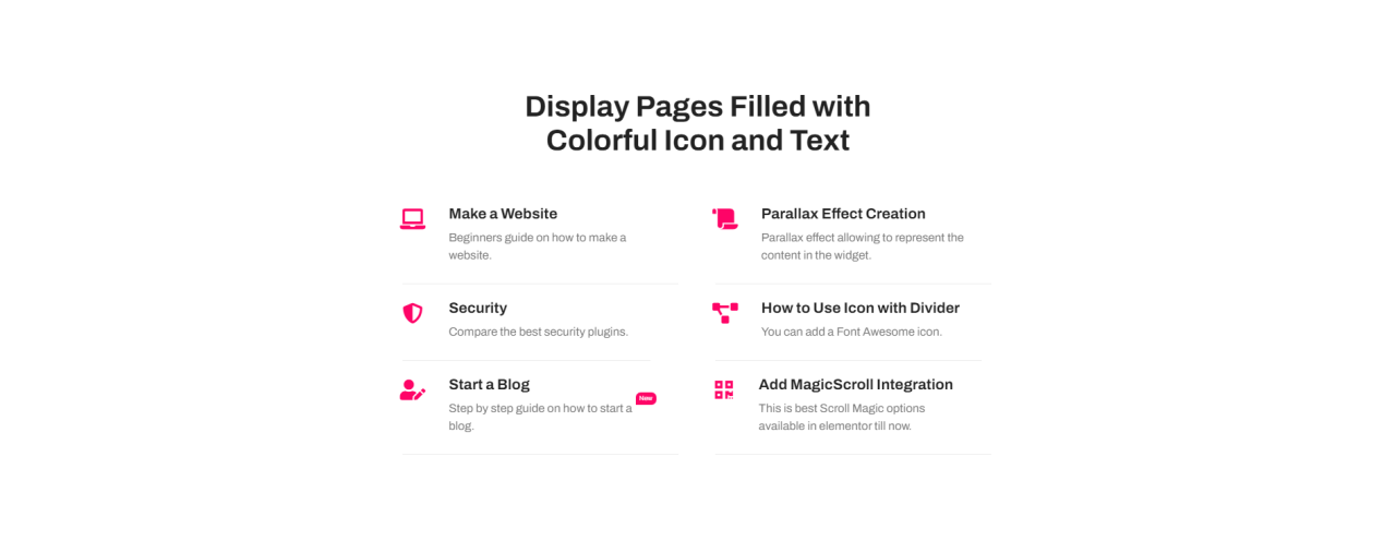 Display Pages Filled with Colorful Icon and Text Make a Website Beginners guide on how to make a website. Parallax Effect Creation Parallax effect allowing to represent the content in the widget. Security Compare the best security plugins. How to Use Icon with Divider You can add a Font Awesome icon. Start a Blog Step […]