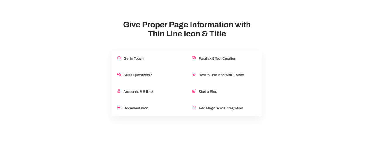Give Proper Page Information with Thin Line Icon & Title Get In Touch Parallax Effect Creation Sales Questions? How to Use Icon with Divider Accounts & Billing Start a Blog Documentation Add MagicScroll Integration