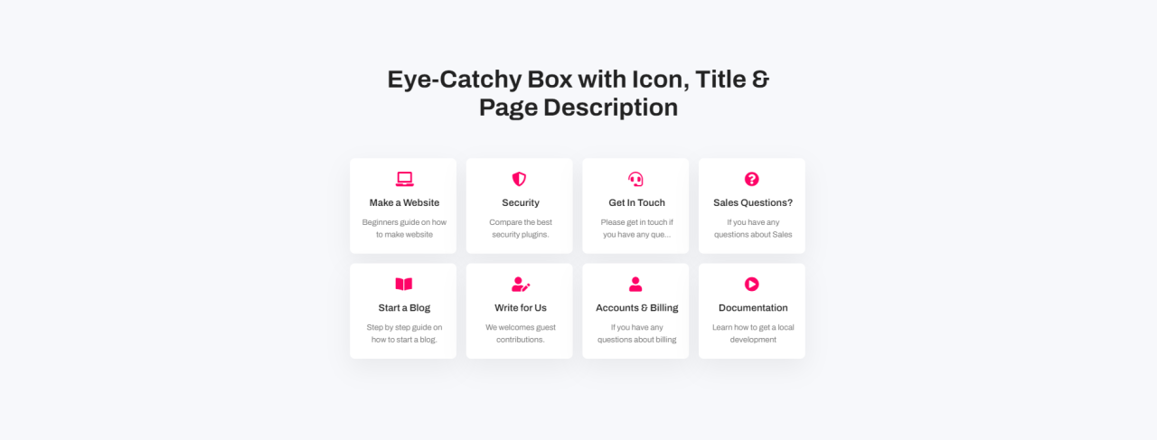 Eye-Catchy Box with Icon, Title & Page Description Make a Website Beginners guide on how to make website Security Compare the best security plugins. Get In Touch Please get in touch if you have any que… Sales Questions? If you have any questions about Sales Start a Blog Step by step guide on how to […]