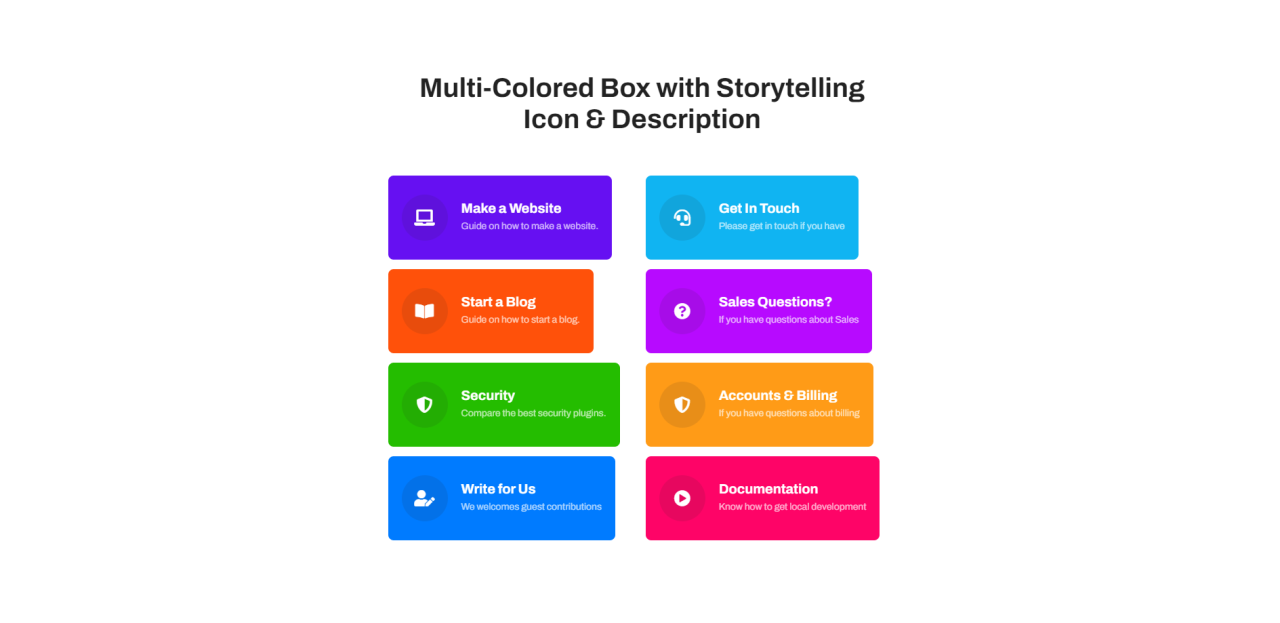 Multi-Colored Box with Storytelling Icon & Description Make a Website Guide on how to make a website. Get In Touch Please get in touch if you have Start a Blog Guide on how to start a blog. Sales Questions? If you have questions about Sales Security Compare the best security plugins. Accounts & Billing If […]
