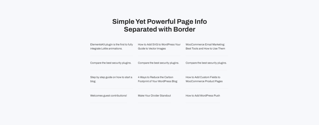 Simple Yet Powerful Page Info Separated with Border ElementsKit plugin is the first to fully integrate Lottie animations. How to Add SVG to WordPress Your Guide to Vector Images WooCommerce Email Marketing: Best Tools and How to Use Them Compare the best security plugins. Compare the best security plugins. Compare the best security plugins. Step […]
