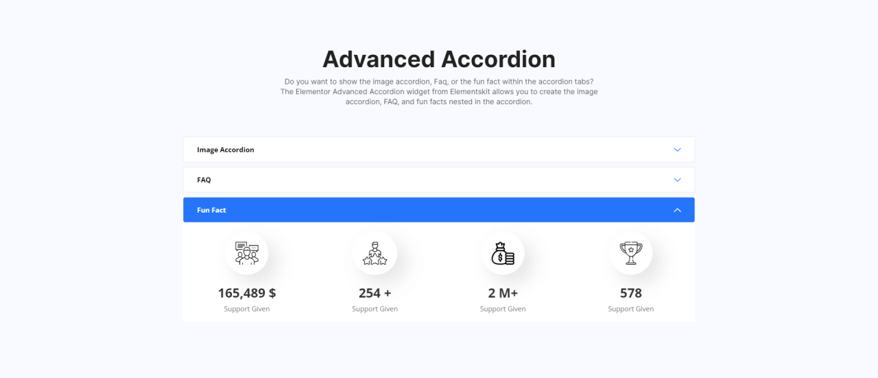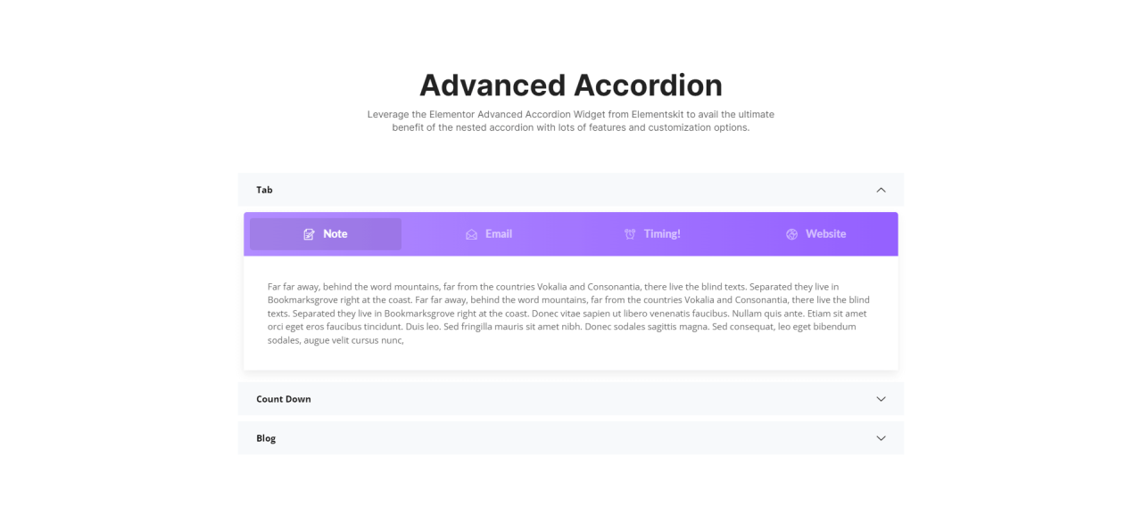 Advanced Accordion Leverage the Elementor Advanced Accordion Widget from Elementskit to avail the ultimate benefit of the nested accordion with lots of features and customization options. Tab Edit Content Note Email Timing! Website Far far away, behind the word mountains, far from the countries Vokalia and Consonantia, there live the blind texts. Separated they live […]