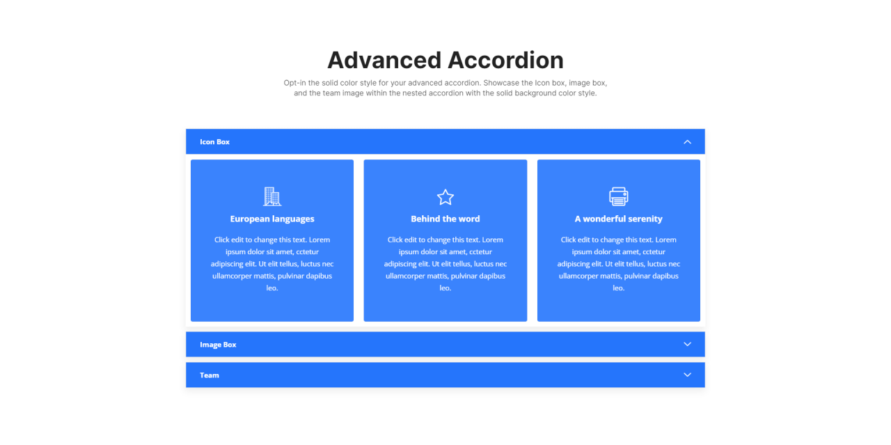 Advanced Accordion Opt-in the solid color style for your advanced accordion. Showcase the Icon box, image box, and the team image within the nested accordion with the solid background color style. Icon Box Edit Content European languages Click edit to change this text. Lorem ipsum dolor sit amet, cctetur adipiscing elit. Ut elit tellus, luctus […]