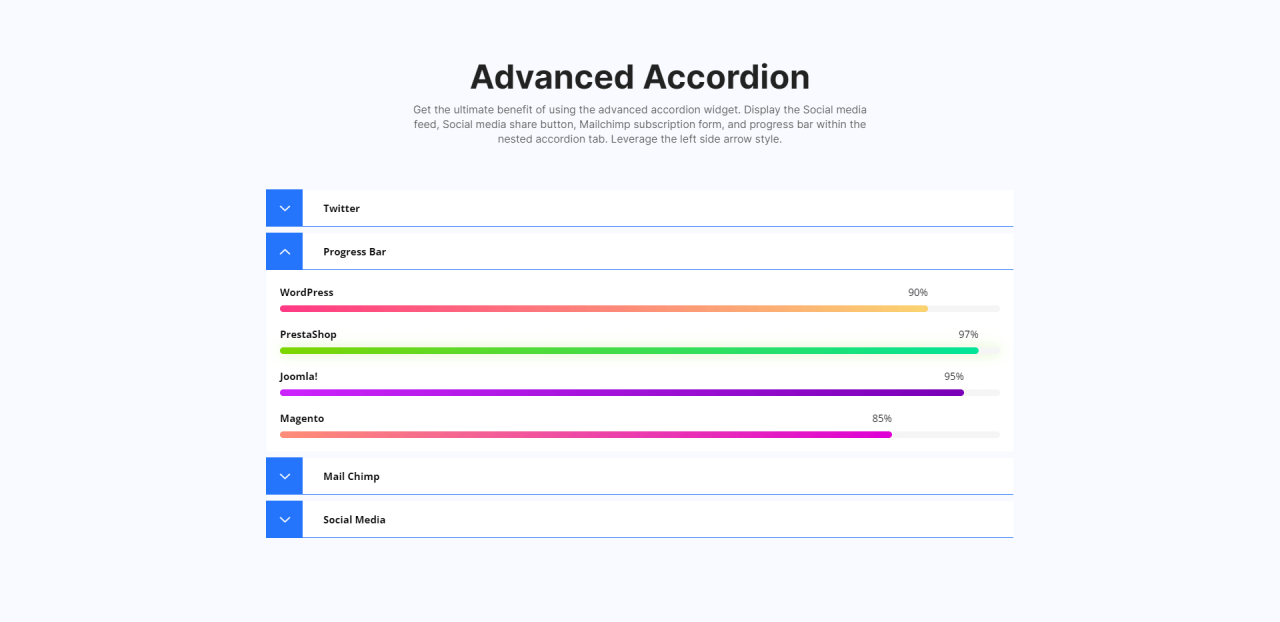 Advanced Accordion Get the ultimate benefit of using the advanced accordion widget. Display the Social media feed, Social media share button, Mailchimp subscription form, and progress bar within the nested accordion tab. Leverage the left side arrow style. Twitter Edit Content Far far away, behind the word mountains, far from the countries Vokalia and Consonantia, […]