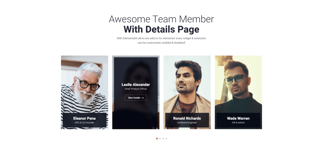 Awesome Team Member With Details Page With ElementsKit all-in-one add-on for elementor every widget & extension can be customized, enabled & disabled! Eleanor Pena CEO & Co-Founder View Details Eleanor Pena CEO & Co-Founder Eleanor Pena CEO & Co-Founder You can also reduce the extra loading time on your WordPress websites. Leverage the best add-on […]