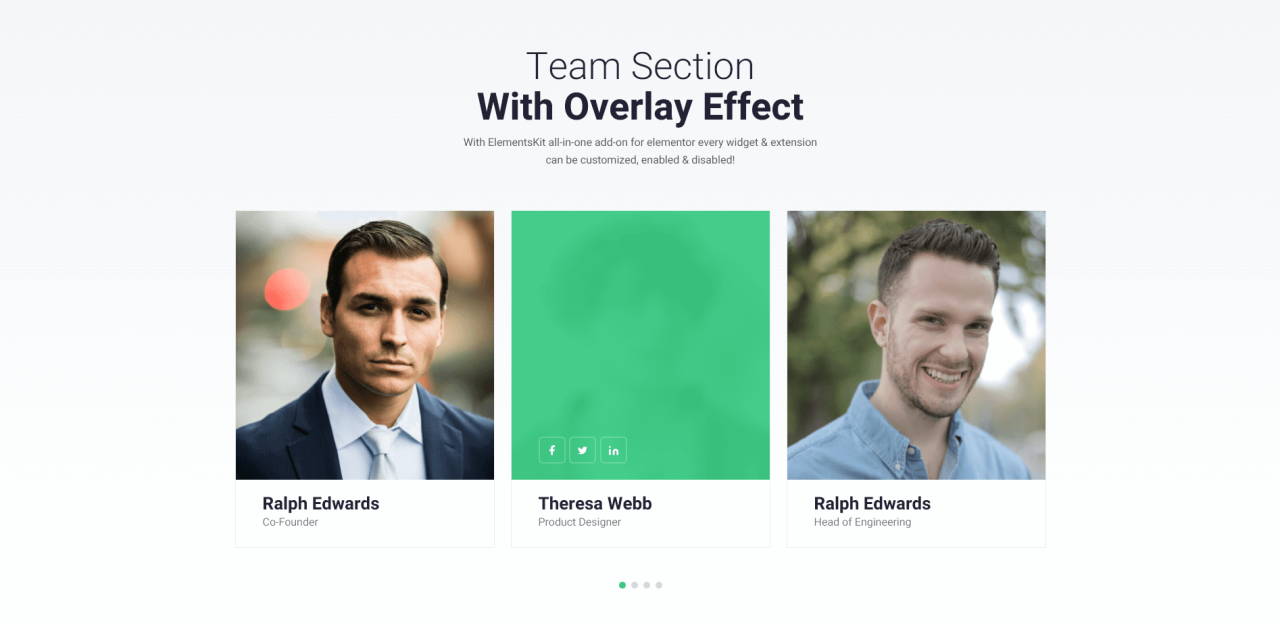 Team Section With Overlay Effect With ElementsKit all-in-one add-on for elementor every widget & extension can be customized, enabled & disabled! Ralph Edwards Co-Founder Theresa Webb Product Designer Ralph Edwards Head of Engineering Leslie Alexander Support Engineer