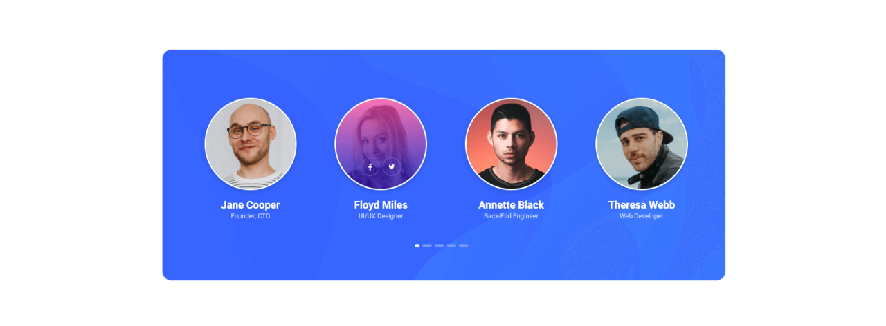 Jane Cooper Founder, CTO Floyd Miles UI/UX Designer Annette Black Back-End Engineer Theresa Webb Web Developer Guy Hawkins Support Engineer