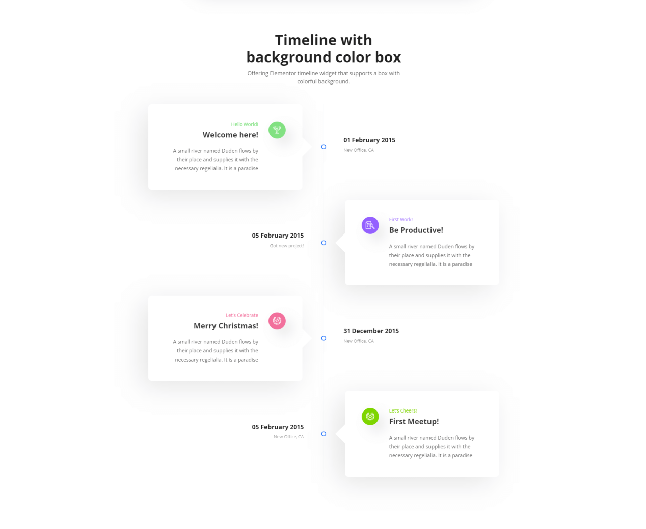 Timeline with background color box Offering Elementor timeline widget that supports a box with colorful background. Hello World! Welcome here! A small river named Duden flows by their place and supplies it with the necessary regelialia. It is a paradise 01 February 2015 New Office, CA First Work! Be Productive! A small river named Duden […]