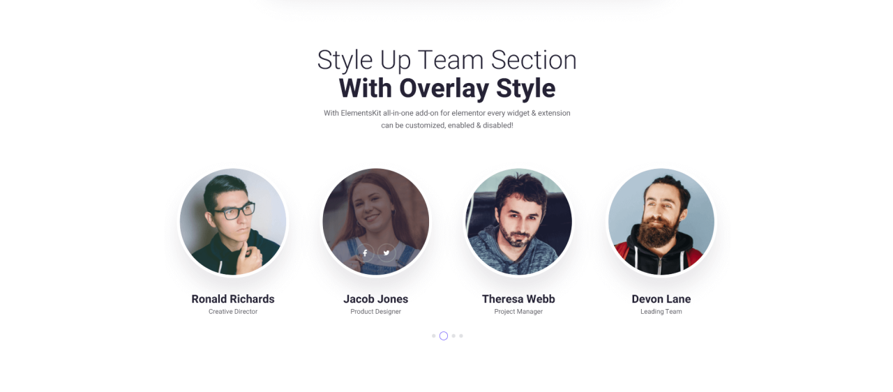 Style Up Team Section With Overlay Style With ElementsKit all-in-one add-on for elementor every widget & extension can be customized, enabled & disabled! Devon Lane Leading Team Ronald Richards Creative Director Jacob Jones Product Designer Theresa Webb Project Manager
