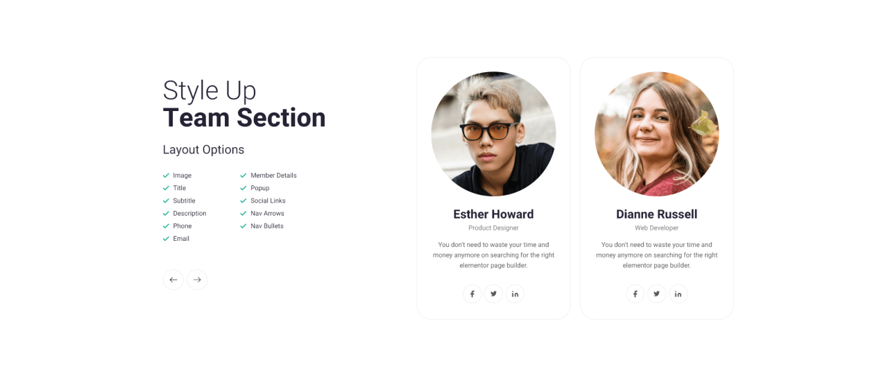 Style Up Team Section Layout Options Image Title Subtitle Description Phone Email Member Details Popup Social Links Nav Arrows Nav Bullets Esther Howard Product Designer You don’t need to waste your time and money anymore on searching for the right elementor page builder. Dianne Russell Web Developer You don’t need to waste your time and […]